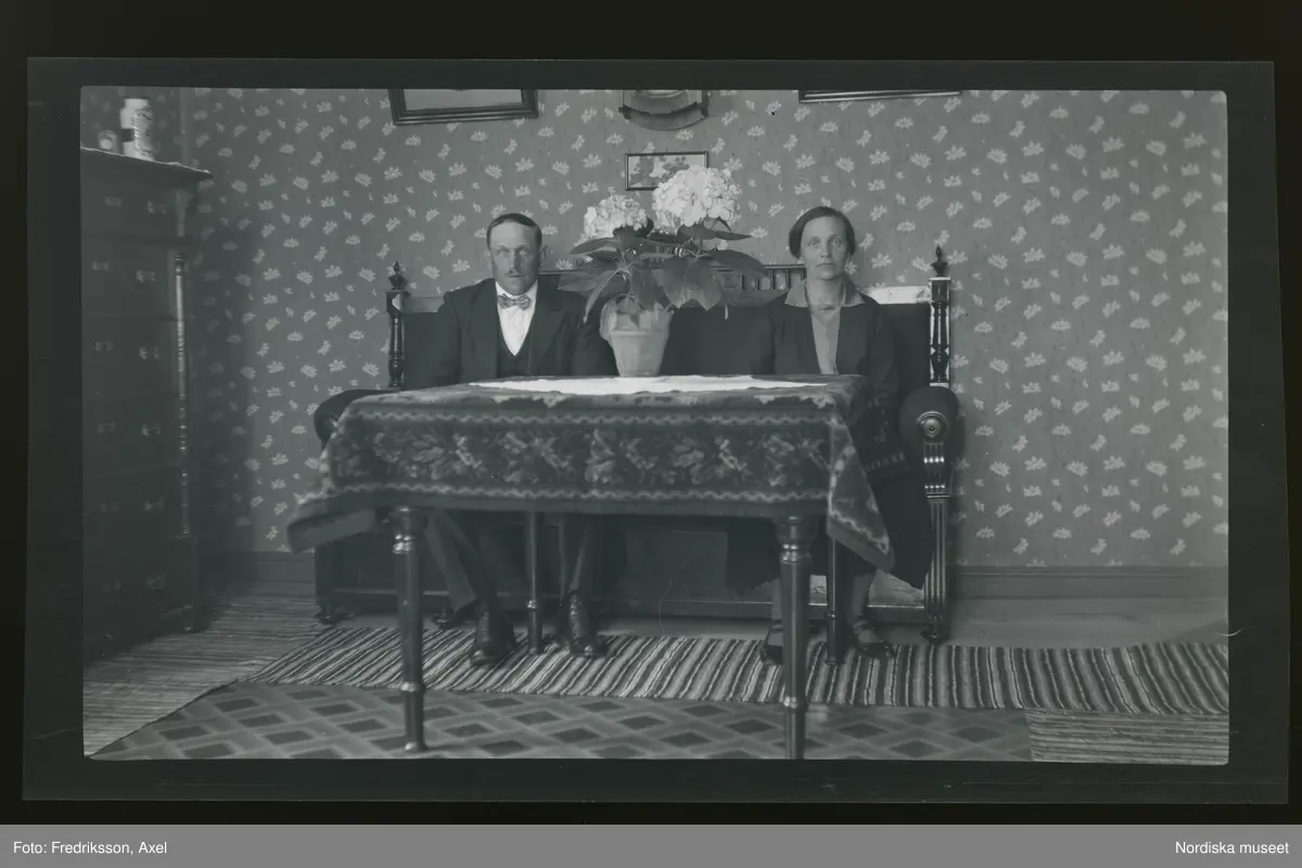 En man och en kvinna sitter i en soffa i ett rum med mönstrade tapeter.