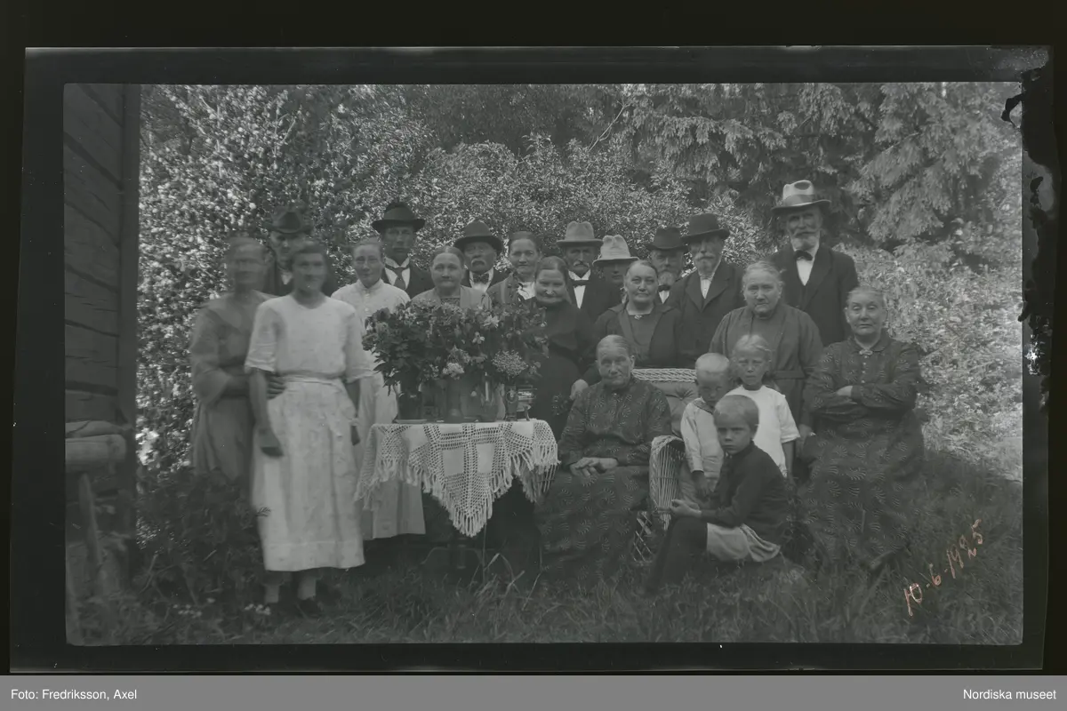 Ett sällskap poserar i en trädgård, en äldre kvinna sitter i en korgstol vid ett litet bord med duk och gratulations-blommor i vas.