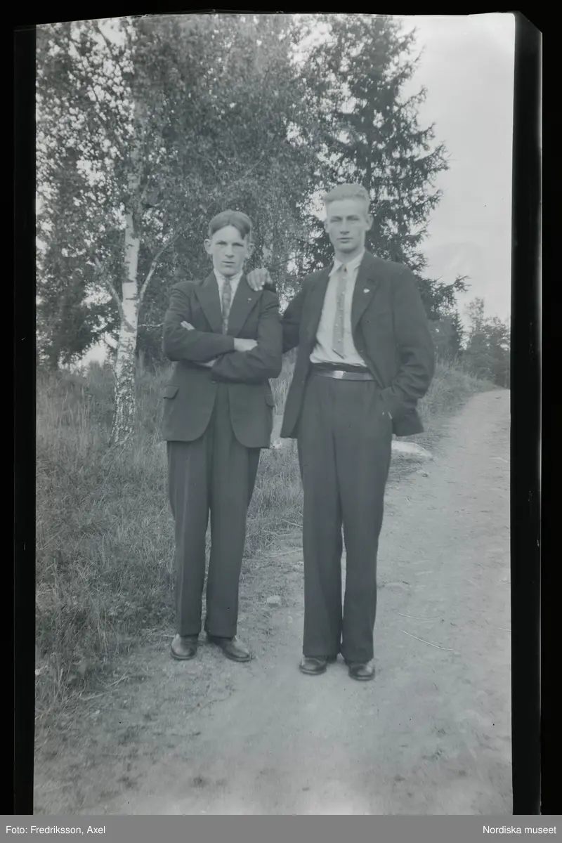 "Båsbo Olle och Claes Vahlström, (Claes till vänster försvann vid Hårsfjärdsolyckan)."