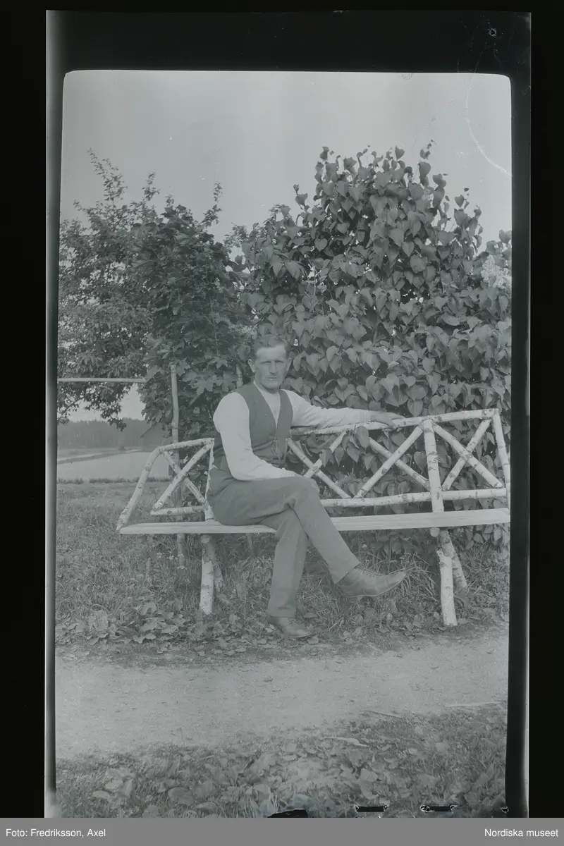 Axel Fredriksson sitter i en trädgård på en bänk snickrad av björk.