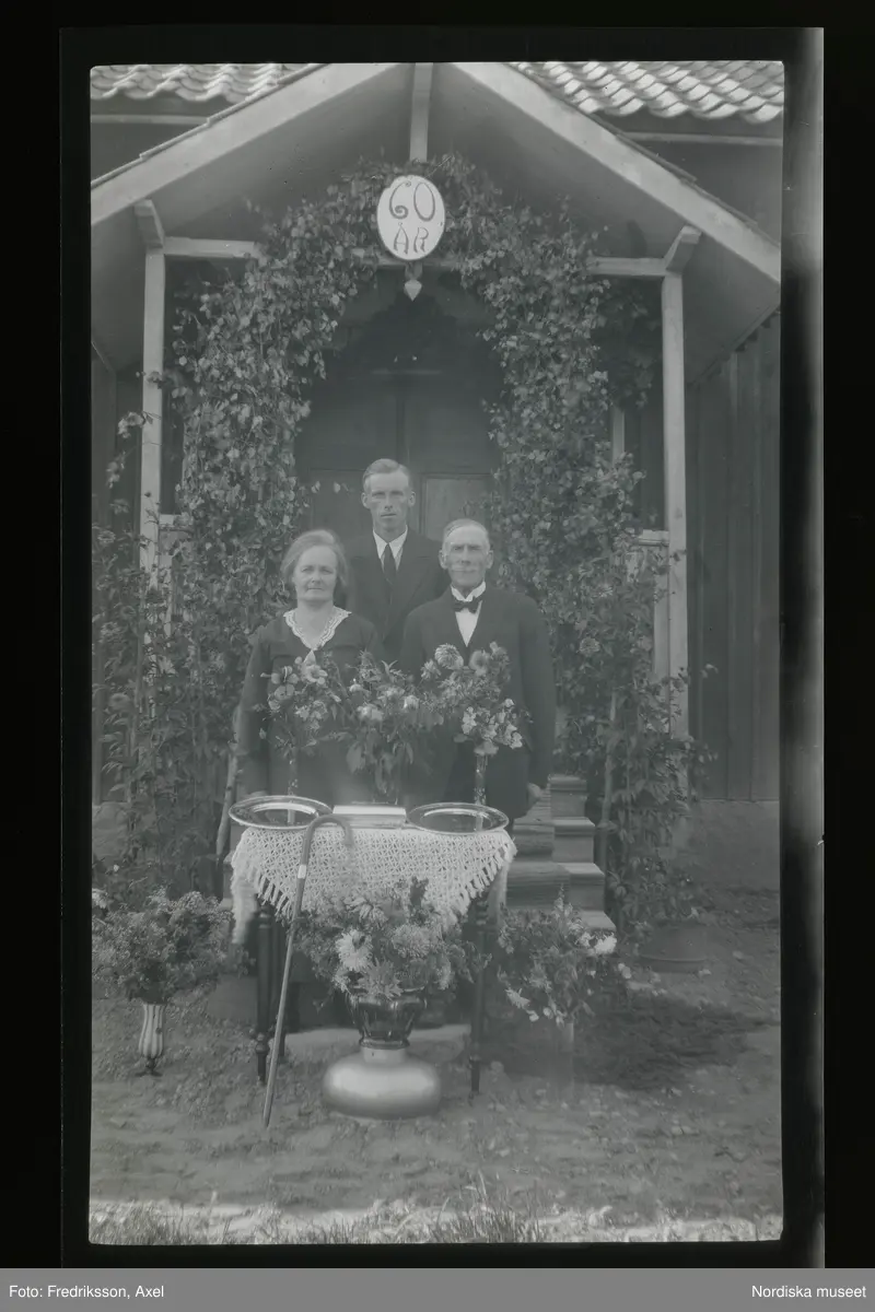 Grupporträtt. Ett par och en ung man poserar framför ett hus. Vid förstubron är en lövad båge uppställd med skylt '60 år', framför dem står ett litet bord med två silverfat och blombuketter.