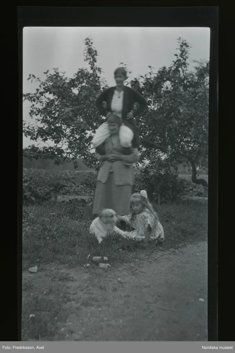 Lek i trädgården. En kvinna bär en annan på sina axlar, två flickor sitter i gräset framför dem.