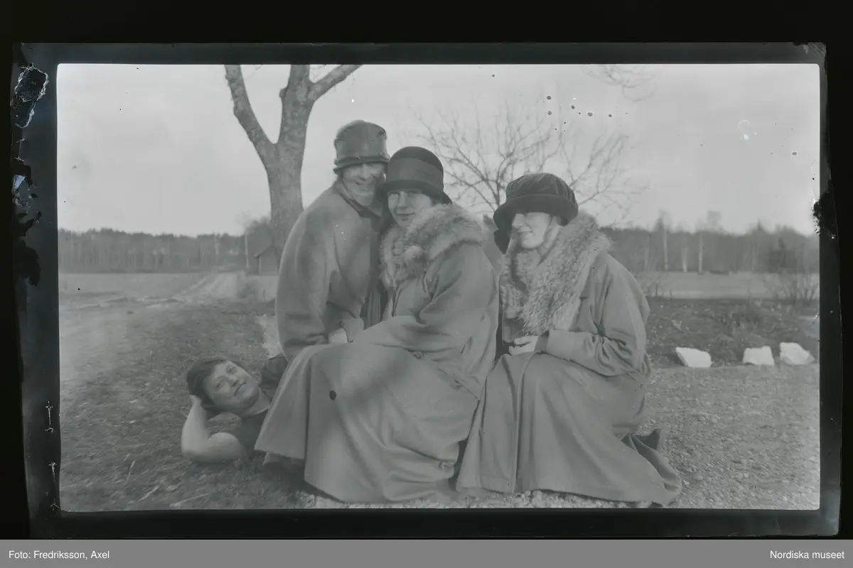Humoristisk bild där Frida Fredriksson ligger på marken och tre vänninor sitter på henne.