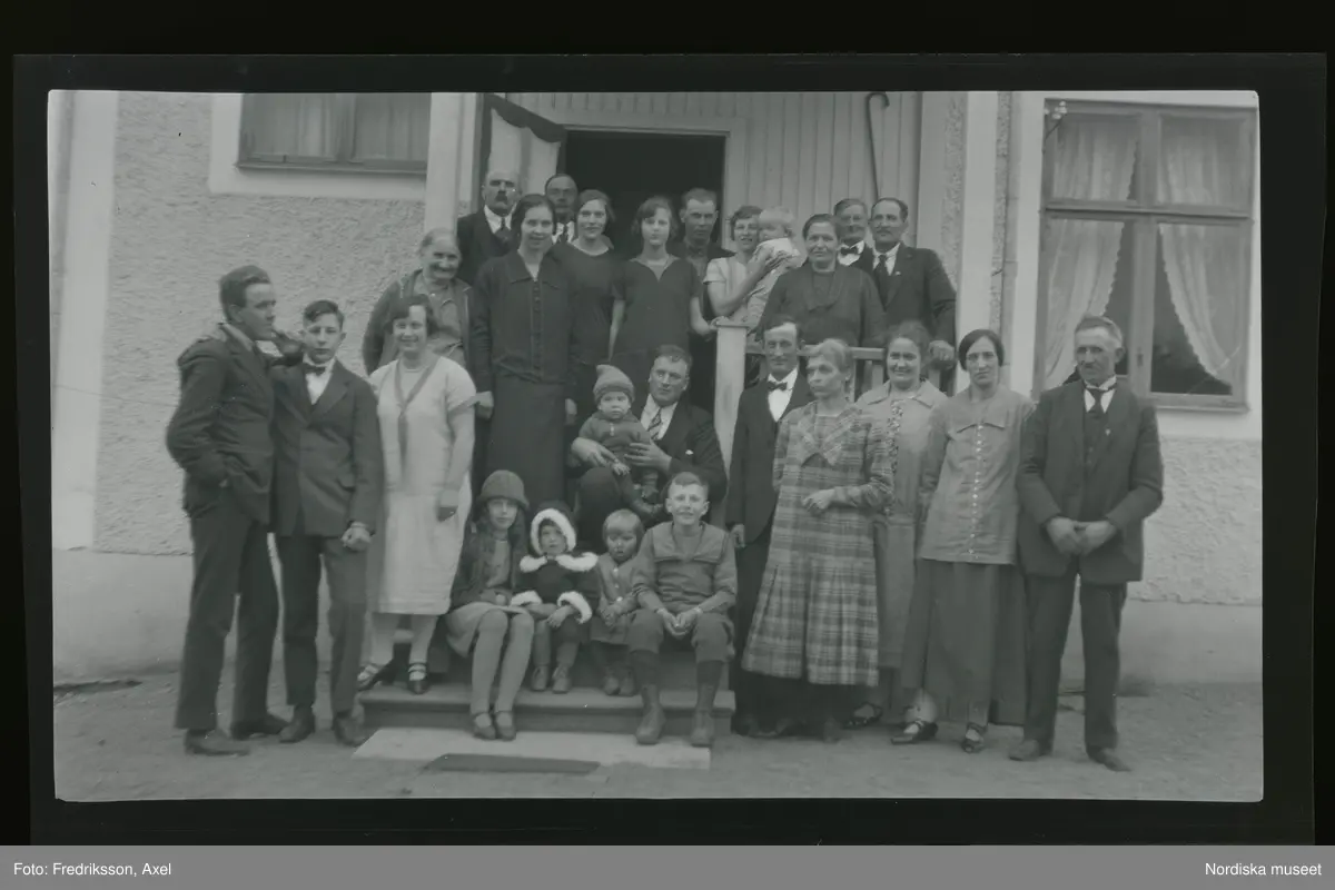 Grupporträtt. Kvinnor, män och barn poserar på trappan till ett hus.