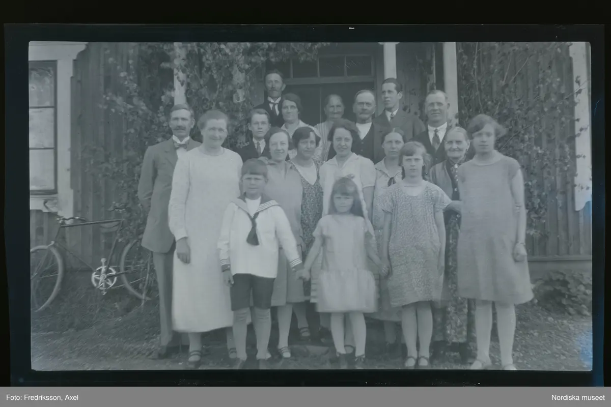Grupporträtt. Kvinnor, män och barn poserar på trappan till ett hus.