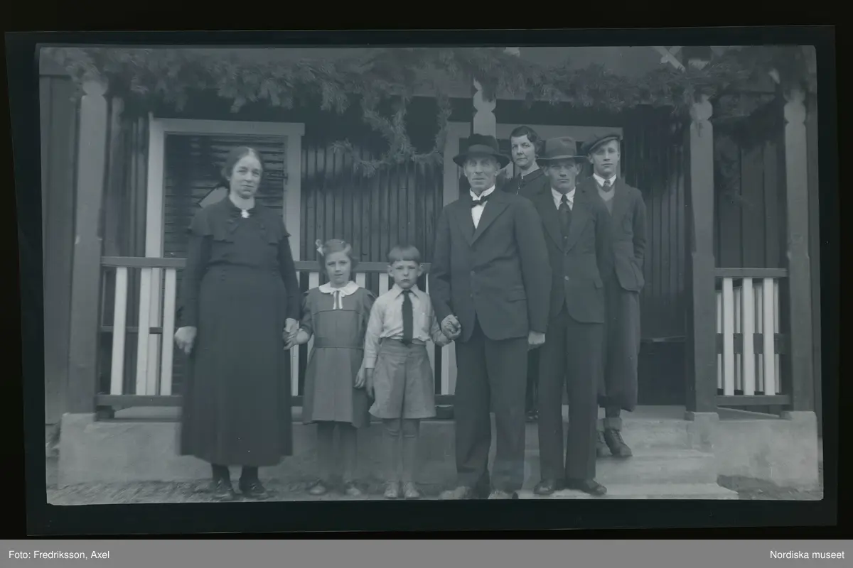 Grupporträtt. Kvinnor, män och barn poserar på farstubron till ett hus. Ovanför dem hänger tallris som formar '50'.