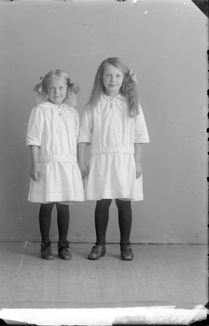 Porträtt av två små flickor som håller varandras hand. Syskon.