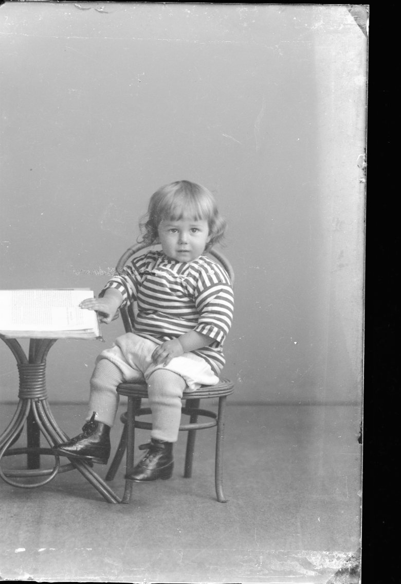 Porträtt av en liten pojke som sitter in en barnmöbel. Han har en randig tröja. Ser lite ängslig ut.