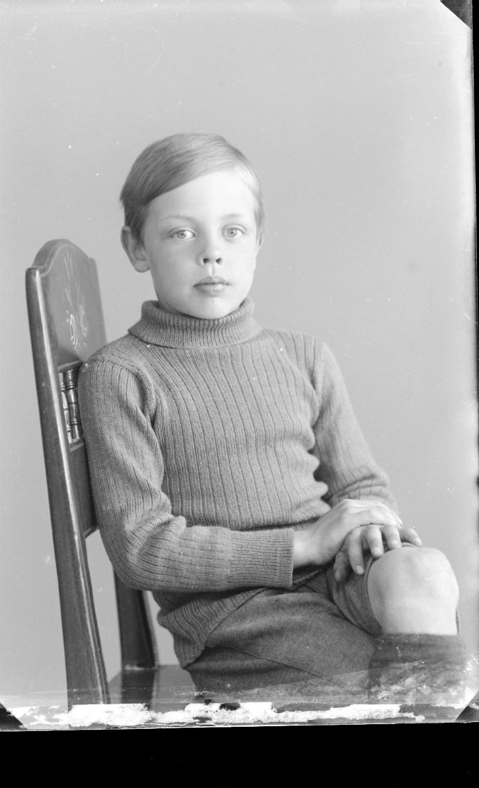 Porträtt av en liten pojke med kortbyxor och höga sockar. Han sitter på en stol.