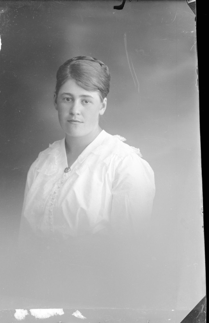 Porträtt av en ung kvinna med uppsatt fläta. Bröstbild.