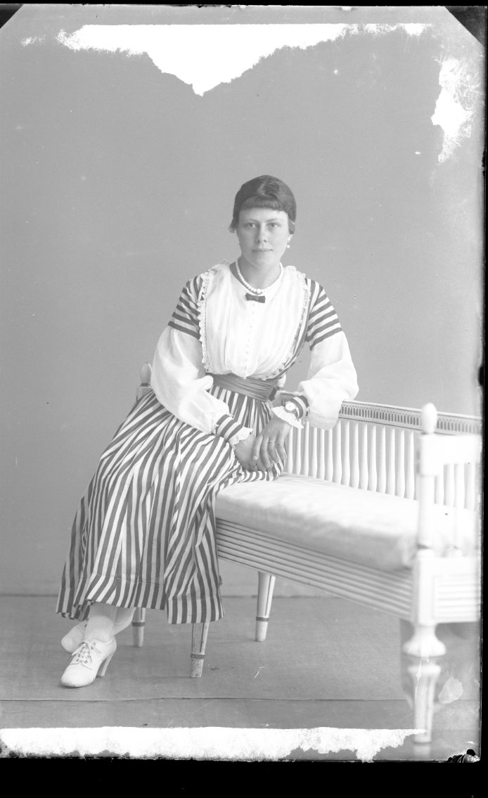 Porträtt av en ung ung kvinna i randig klänning och "pärlhalsband" som sitter i en soffa av gustaviansk stil.
