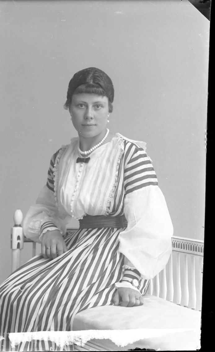 Porträtt av en ung ung kvinna i randig klänning och "pärlhalsband" som sitter i en soffa av gustaviansk stil.
