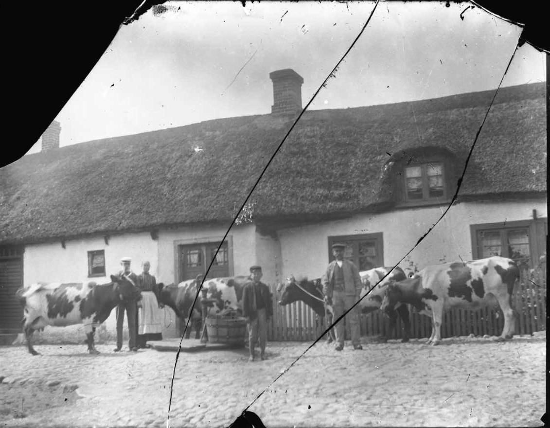 Två män, en kvinna och en pojke står vid en brunn på en kullerstensbelagd gårdsplan med kor och tjurar. Rappad ljus envåningsbyggnad med vasstak bakom dem. Skåne?
