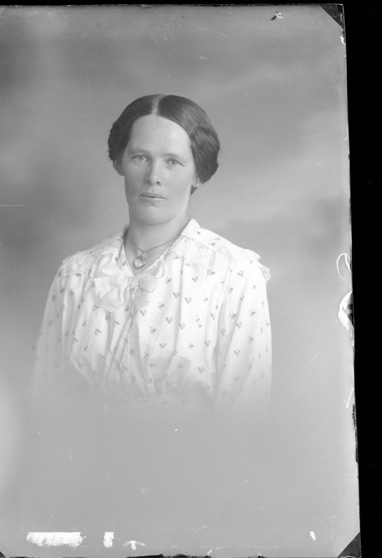 Porträtt av en ung kvinna med ljus mönstrad klänning, och halssmycke. Bröstbild.
