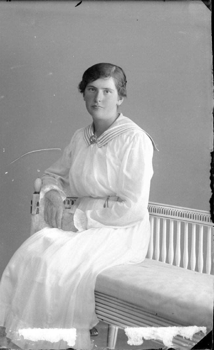 Porträtt av en ung kvinna i vit klänning med sjömanskrage, hon sitter i en soffa av gustaviansk stil.