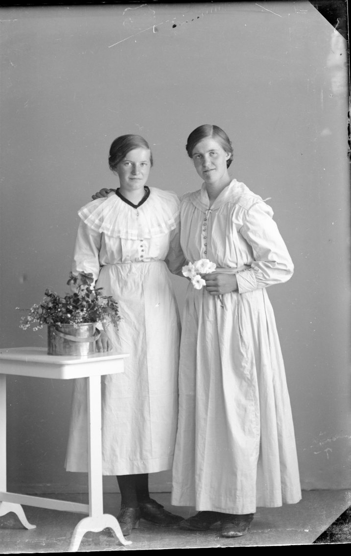 Porträtt av två unga kvinnor i vita klänningar med spetskrage. De håller om varandra, en håller blommor i ena handen. De står vid ett bord med blommor. Sannolikt syskon.