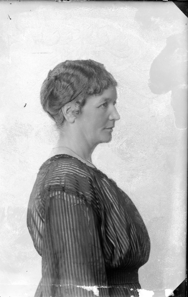 Porträtt av kvinna i randig klänning, profil. Bröstbild.
