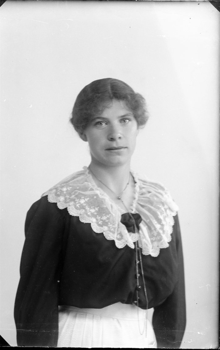 Porträtt av en ung kvinna med halsband, vit spetskrage och troligen vitt förkläde, bröstbild.