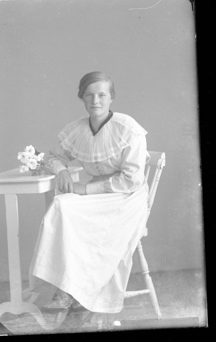 Porträtt av en ung kvinna i vit klänning med spetskrage. Hon sitter på en pinnstol vid ett bord.
