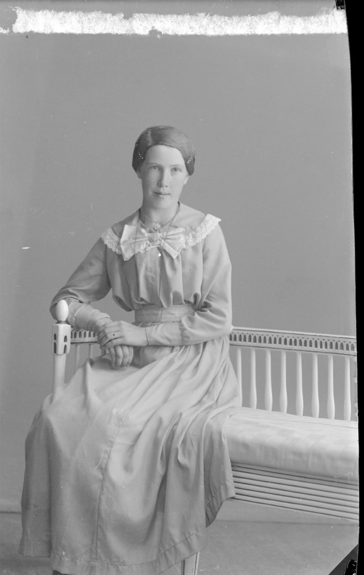 Porträtt av en ung kvinna som sitter i änden på en soffa.