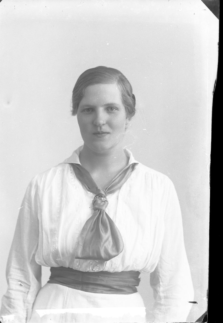 Porträtt av en ung kvinna i vit klänning med mörk scarf runt halsen och mörkt band runt midjan. Bröstbild.