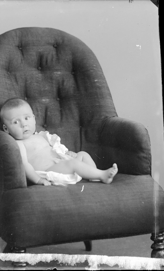 Porträtt av ett spädbarn som sitter i fåtölj.