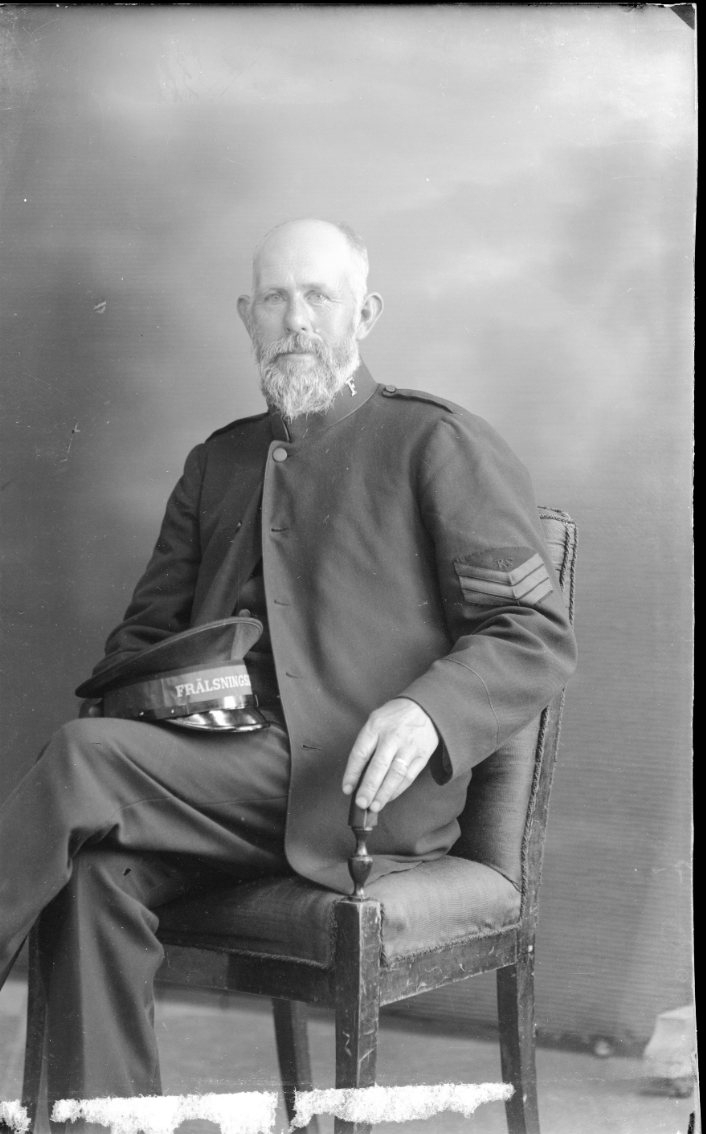 Porträtt av en man med skägg klädd i frälsningsarméns uniform. Han sitter på en stol.