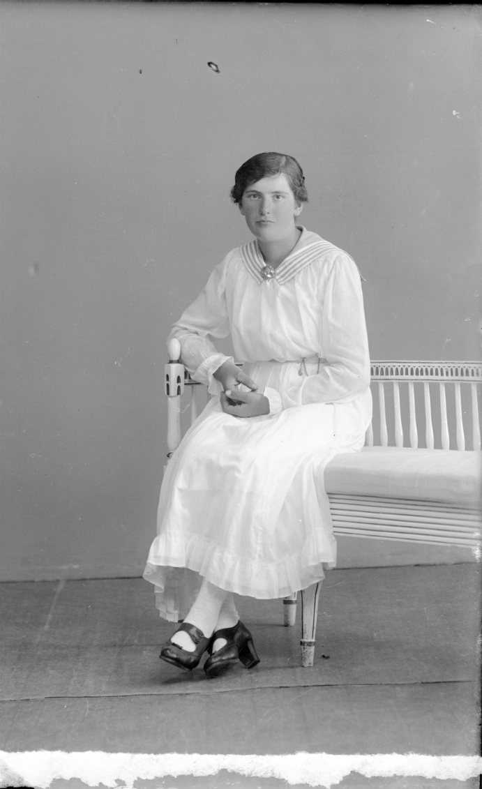 Porträtt av en ung kvinna i vit klänning med sjömanskrage, hon sitter i en soffa av gustaviansk stil.