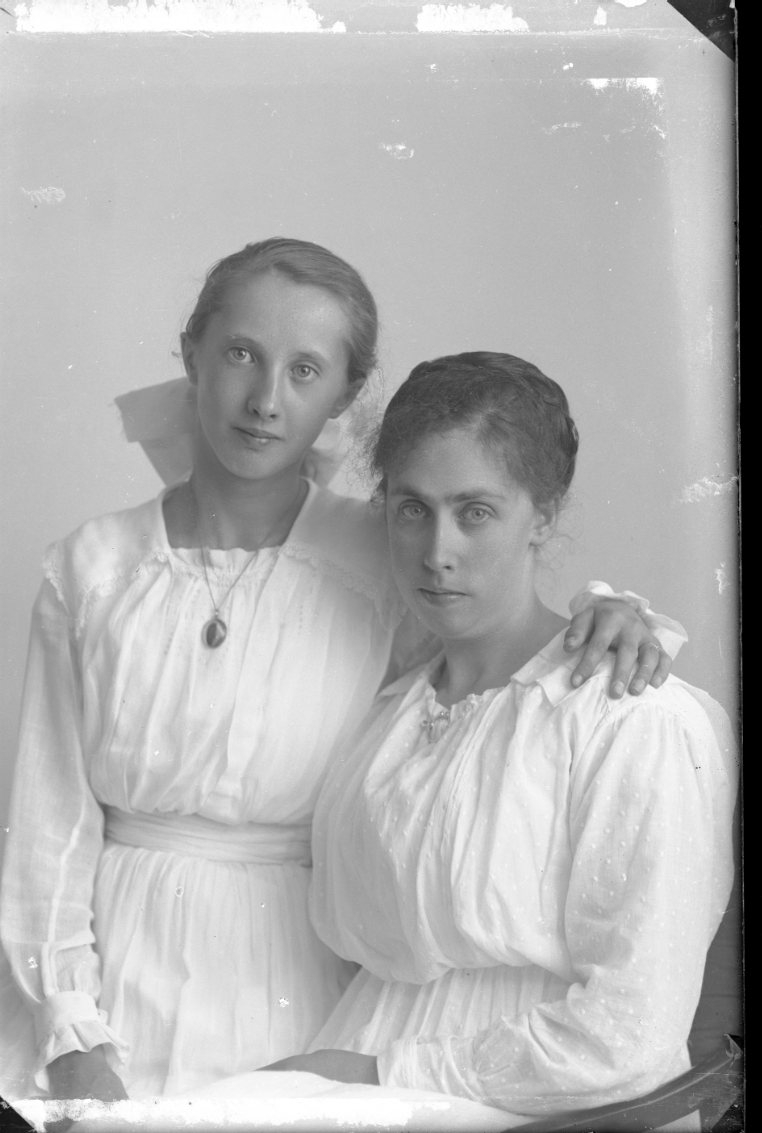 Porträtt av en flicka med rosett i nacken, halssmycke och vit klänning. Hon står intill en ung kvinna som sitter på en stol. Sannolikt fotografi i anslutning till flickans konfirmation.