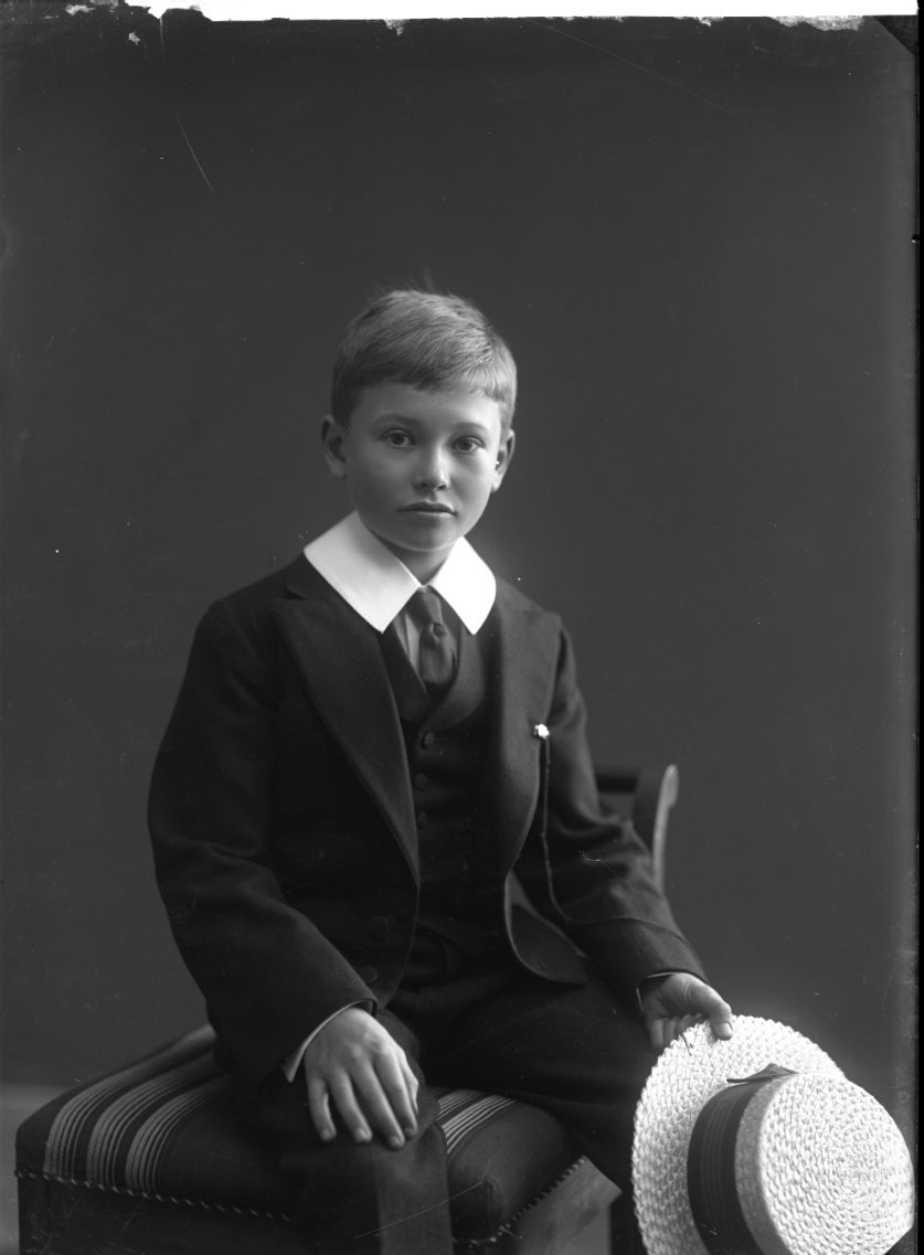 Porträtt av okänd liten pojke. Han sitter på en stol med randigt tyg, med en hatt i ena handen.