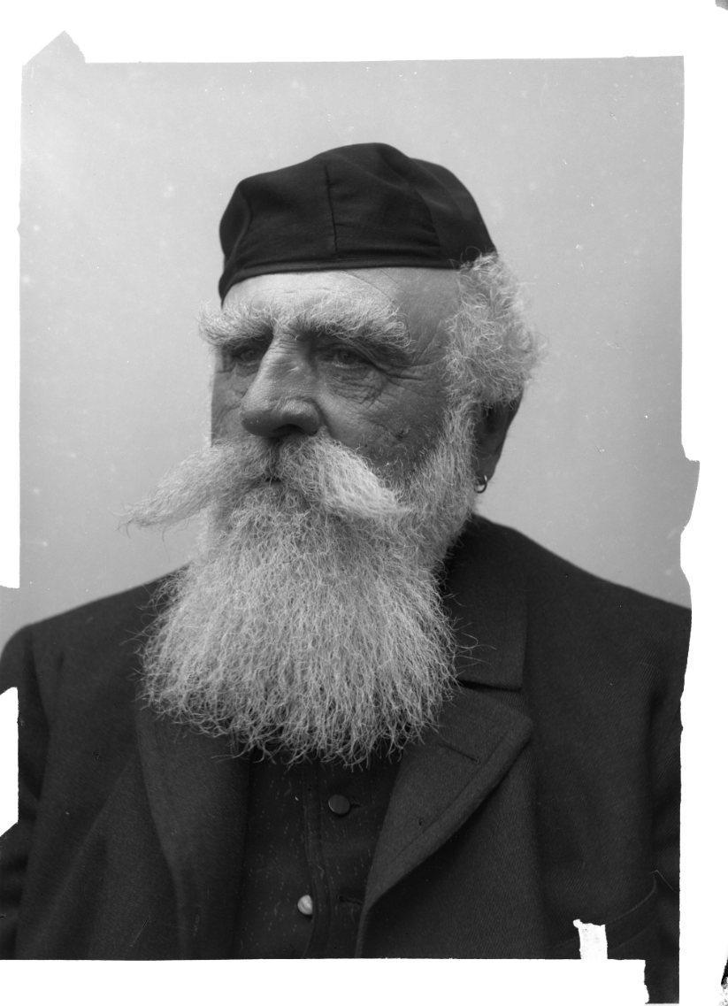 Porträtt av en okänd man med stort vitt skägg och liten mössa på huvudet.