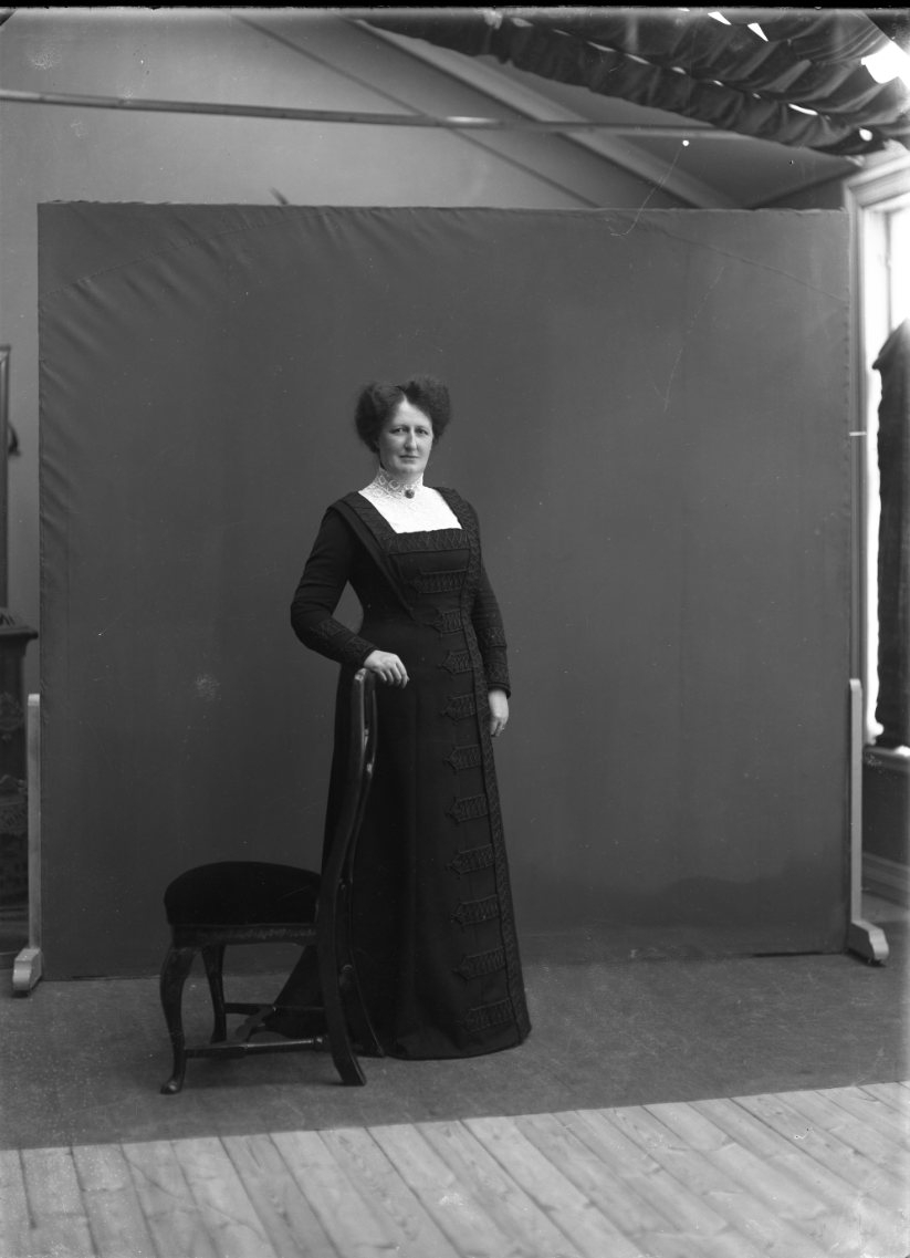 Porträtt av en kvinna i mörk klänning med vit krage. Hon står med ena handen på en stolsrygg.