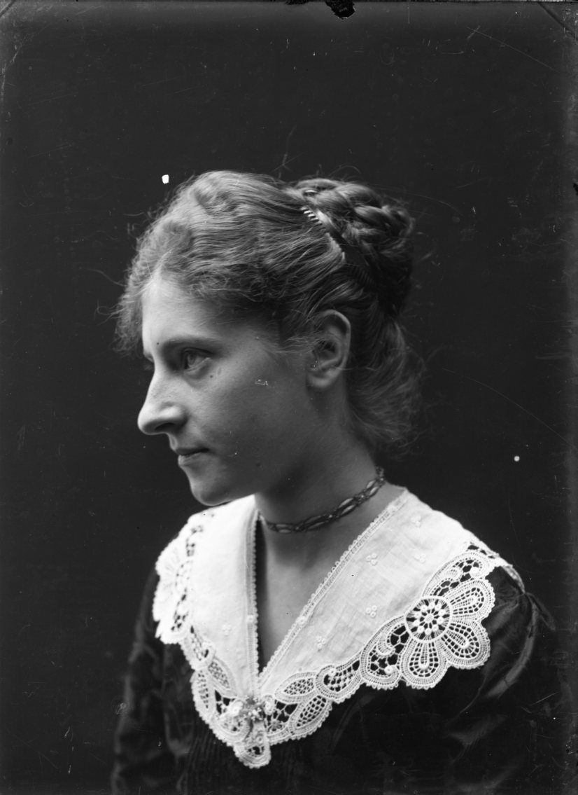 Porträtt av okänd ung kvinna med vit virkad krage, bröstbild, profil.