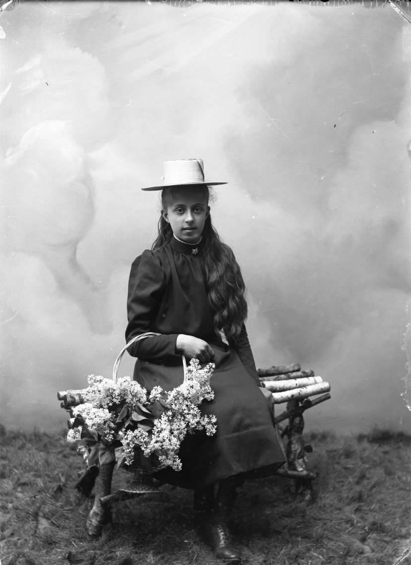 Porträtt av okänd flicka som sitter på en bänk med en korg med blommor. Hon har en hatt på huvudet.
