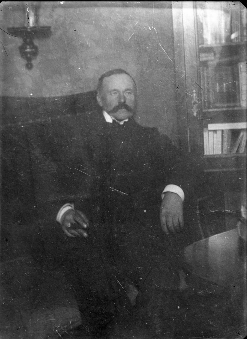 Porträtt av en okänd man i hemmiljö. Han sitter i en soffa med en cigarr i höger hand.