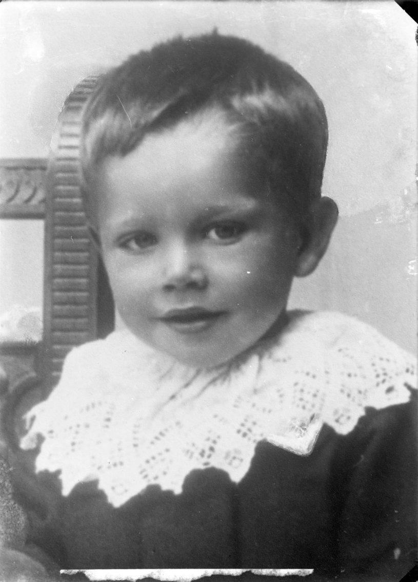 Porträtt av en okänd liten pojke med vit virkad krage, bröstbild.