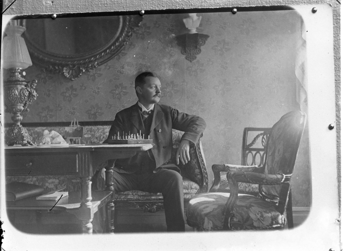 En man sitter i en soffa och tittar mot höger - ett fönster sannolikt. På bordet framför honom står det ett schackspel.