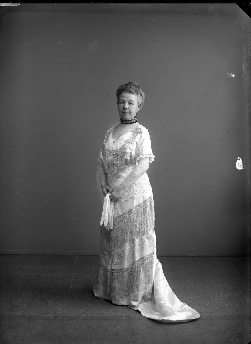 Porträtt av en okänd kvinna i ljus festklänning. Hon håller vita handskar i händerna.