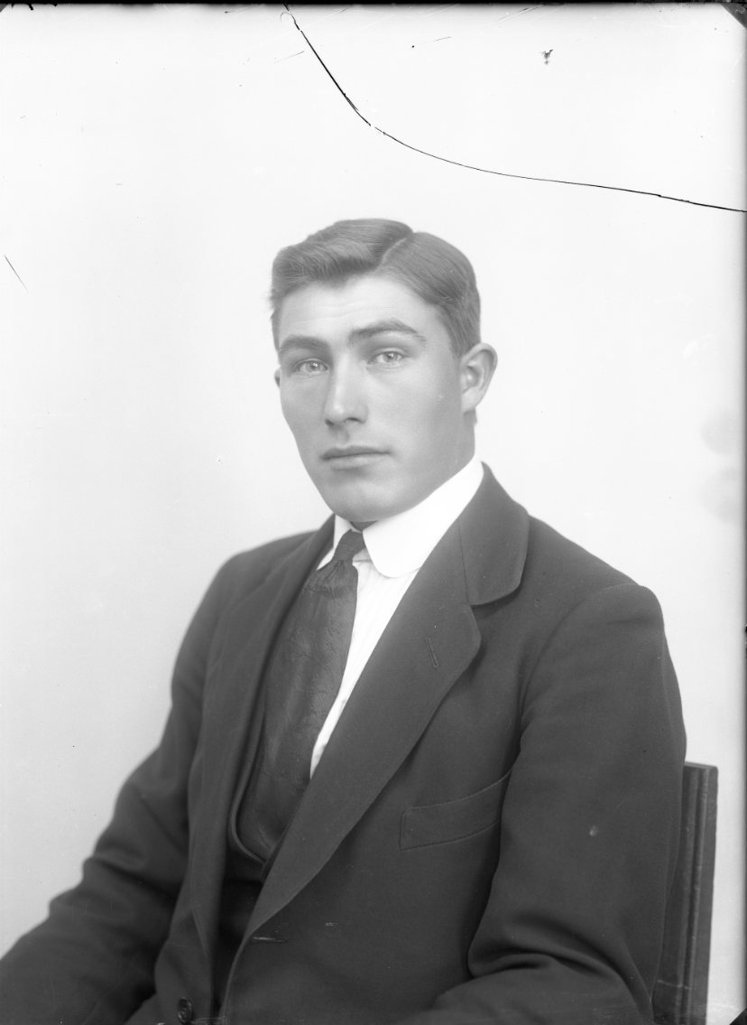 Porträtt av en okänd ung man med slips. Han sitter på en stold, bröstbild.