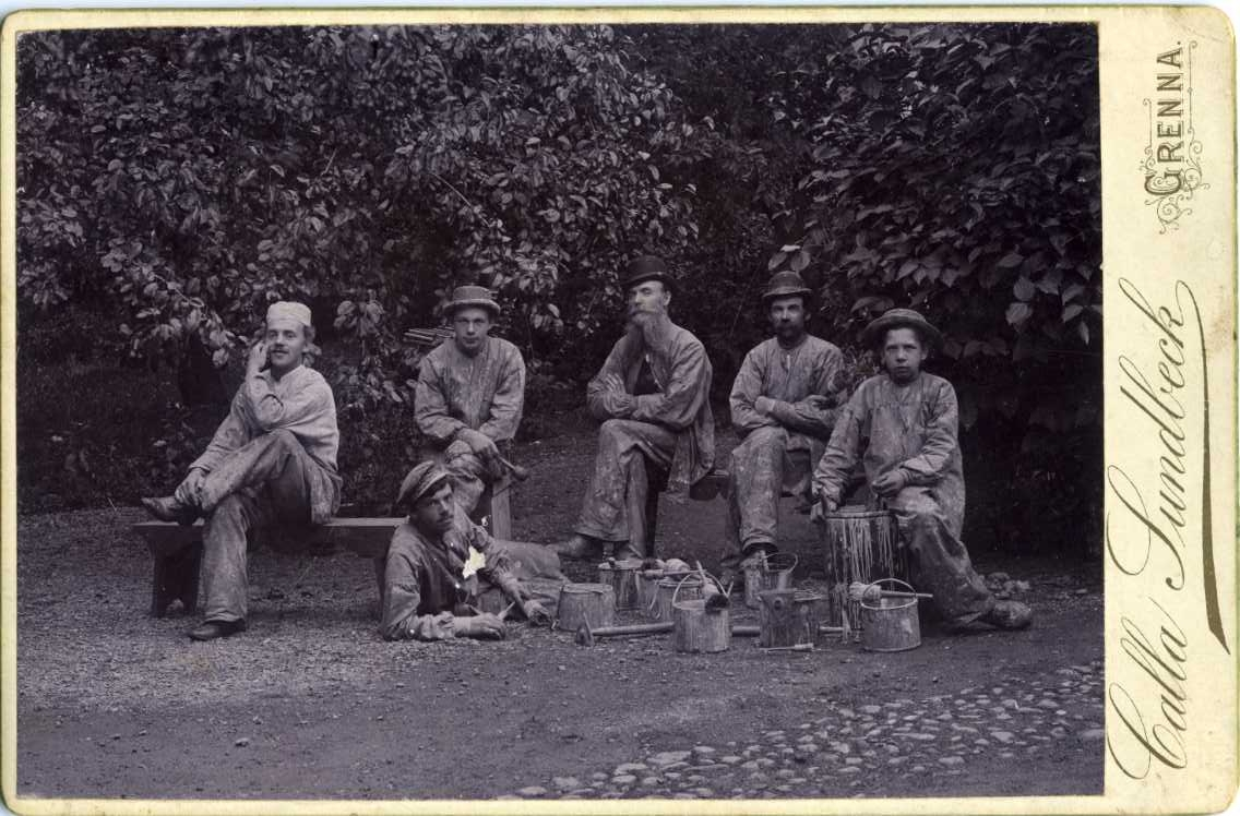 Sex målare tar en paus framför några träd. Målerifirman Berggren & Rundqvist.