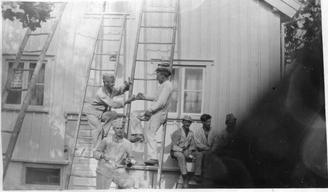 Sju målare vid stegar vid en husgavel. Två står på stegar och spexar.