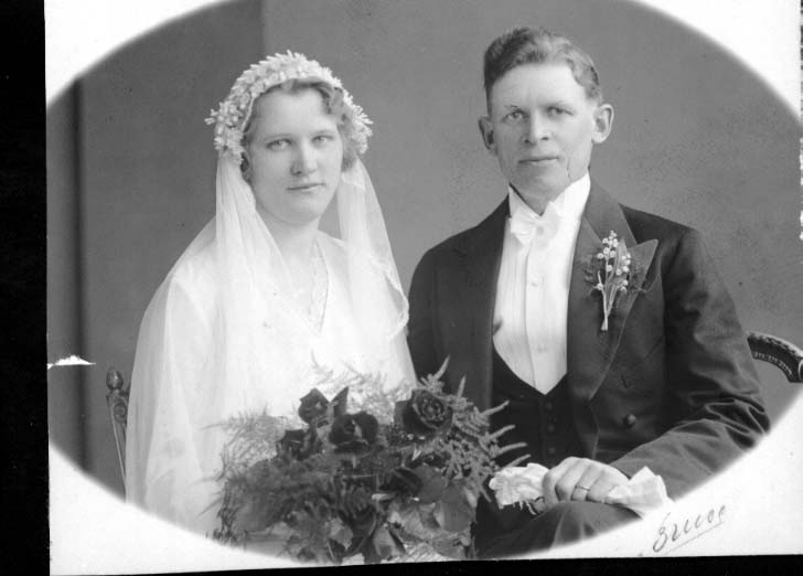 Porträtt av okänt sittande brudpar, bruden i vitt.