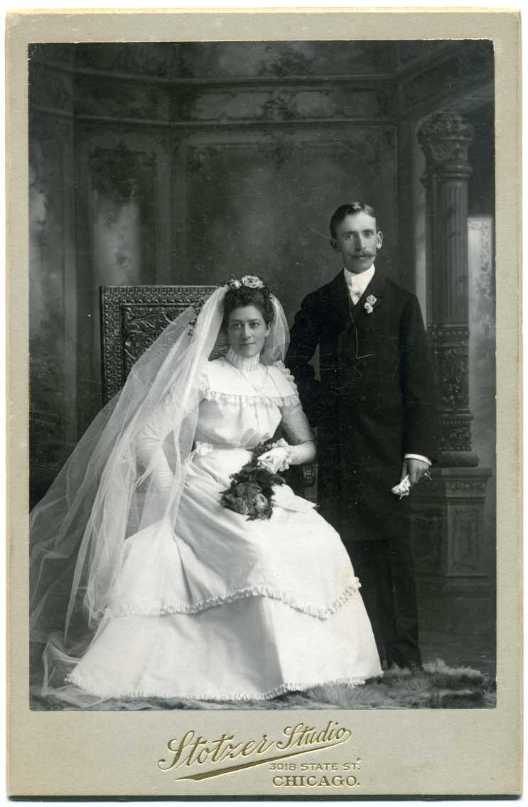 Porträtt av okänt brudpar. Bruden i vitt sitter på en stol.