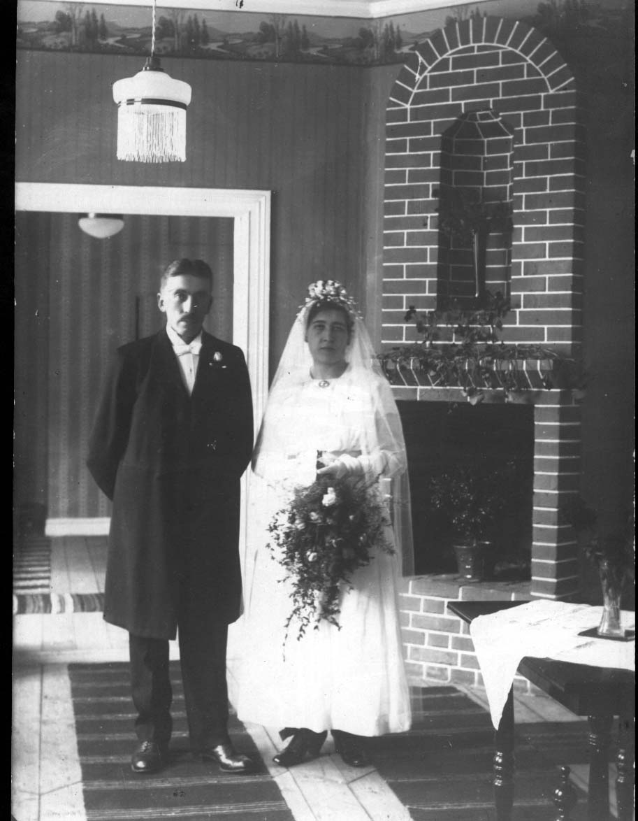 Ett brudpar, bruden i vitt, framför en murad öppen spis.