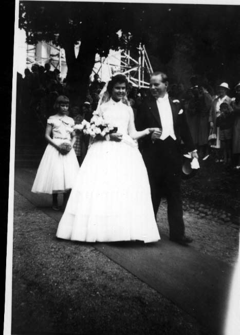 Ett okänt brudpar går på en "röd matta" följd av brudnäbb. Vägen kantad av folk.