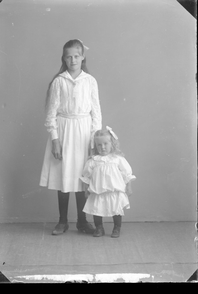 Porträtt av en flicka i tonåren och en liten, båda i vita klänningar. De är syskon.