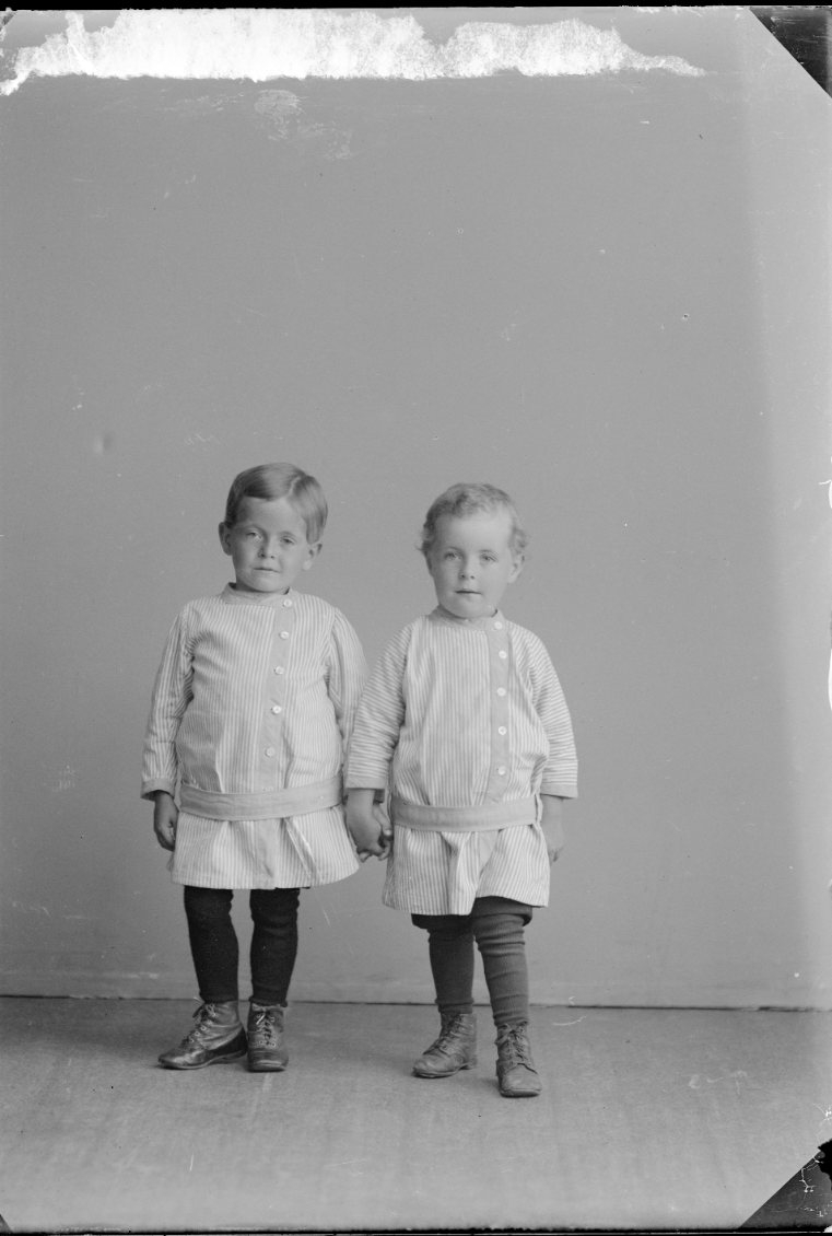 Porträtt av två små barn i randig kolt som håller varandras hand. De är syskon.