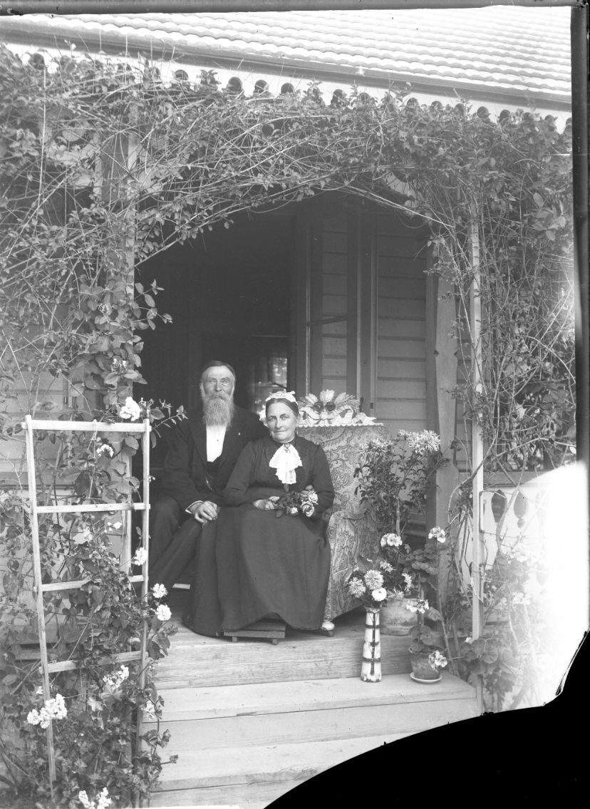 Ett äldre par, mannen med lång skägg, sitter på en farstutrappa. Kvinnan sitter i en fåtölj och mannen på armstödet. De är omgivna av blommor. Klätterväxt på farstun och dess tak. De firar möjligen bröllopsdag.