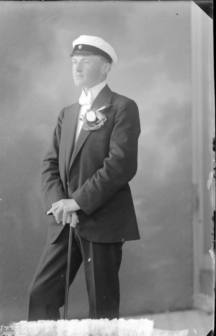 Porträtt av en manlig student. Han står lätt lutad mot en spatserkäpp.