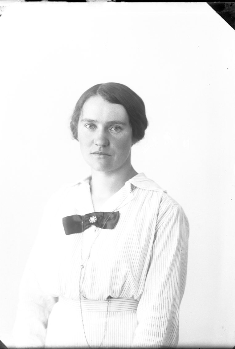 Porträtt av en kvinna i ljus smalrandig klänning.
